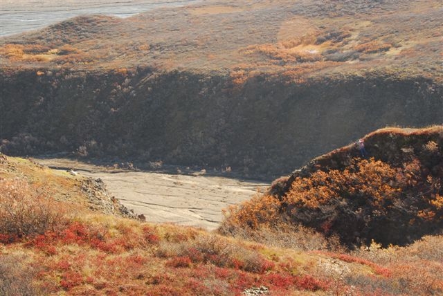 This year we had the opportunity to go into Denali National Park under special circumstances. In an effort to maintain optimal conditions for the wildlife, the road, and the park, the park strictly manages the number of vehicles that travel the park road each year. During the regular summer season, no personal vehicles are allowed into the park beyond the first mile or two. To see the park you have to pay a fee and get aboard a green school bus for a group tour. The park is 6 million acres large but the road is only 92 miles long in total. The buses only go to mile 61 or so. When we first visited the park in 1990 the bouncy bus ride cost us $4 each (an increase from the $2 each our friend in Anchorage told us it was when he went). When we returned in 1998, it cost us $30 each and the price is roughly the same today. At the beginning of the season there's about a week where they let you drive in to the Teklanika (Teck-lan-eek-a) campground about 35 miles in. Last year we spent four days doing this and had a blast.